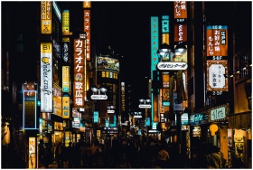 Bustling Shibuya street at night with bright neon signs and crowds, showcasing Tokyo's vibrant nightlife.