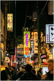Vibrant night scene of Tokyo's street market with neon signs and crowded alley.