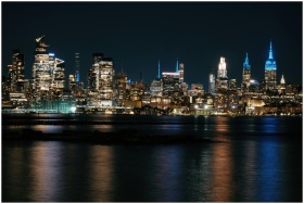 Marvelous view of New York City's illuminated skyline reflecting on the water at night.