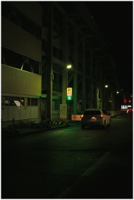 A car drives through a dimly lit urban street at night, illuminated by neon signs and streetlights.