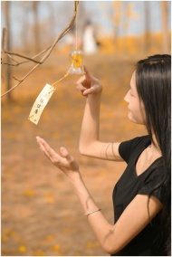 A young woman enjoys the sound of a wind chime on a sunny autumn day, surrounded by golden leaves.
