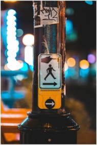 Crosswalk sign on a pole illuminated by streetlights at night with bokeh background.
