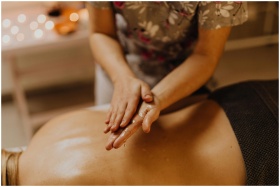 Hands massaging a person's oiled back in a calming