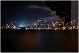 Scenic nighttime view of Sydney Opera House and city skyline under Harbour Bridge.
