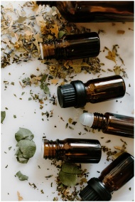 Flat lay of amber glass bottles and dried herbs for aromatherapy on a white surface.