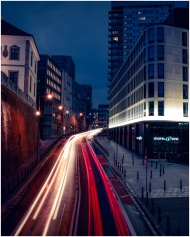 Dynamic long exposure shot of a bustling Warsaw st
