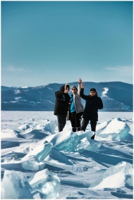 Three people enjoying and celebrating on a snowy and icy terrain with mountains in the background.