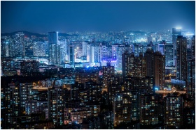 A stunning cityscape at night featuring illuminated skyscrapers and modern urban architecture under a clear sky.
