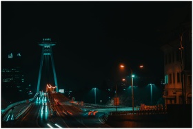 Discover the stunning night view of Bratislava, showcasing the iconic SNP Bridge and city lights.