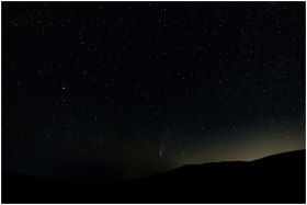 Low angle of spectacular night sky with luminous stars and falling comet over dark mountainous terrain