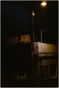 A streetlight illuminates a rural scene with drying laundry at night, capturing a serene and quiet atmosphere.