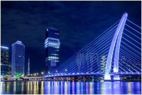 Night view of a modern illuminated bridge with skyscrapers reflecting in a calm river.
