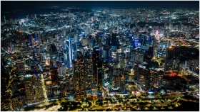 Stunning aerial shot of Panama City's vibrant skyline at night, a bustling urban landscape.