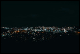 A breathtaking aerial view of a city skyline glowing with lights under a dark night sky.