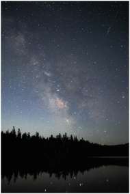 Breathtaking view of the Milky Way galaxy illuminating the night sky over a calm lake and silhouetted trees.
