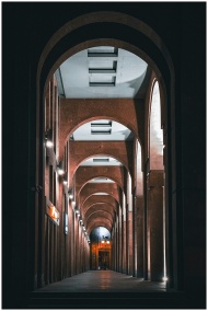 A mesmerizing view of an arched corridor at night