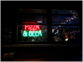 Vibrant neon sign for pizza & beer illuminates a C