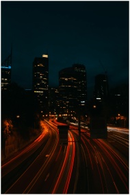 Urban night scene capturing light trails on a highway under a dark sky, showcasing city skyscrapers.