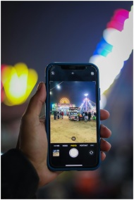 A vibrant amusement park scene captured through a smartphone at dusk.
