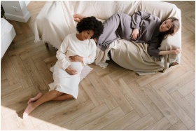 Two pregnant women relaxing on a couch and floor, embracing motherhood in a serene indoor setting.