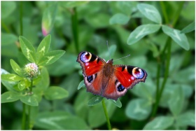 Close-up of a peacock butterfly resting gracefully on green leaves in a summer garden.