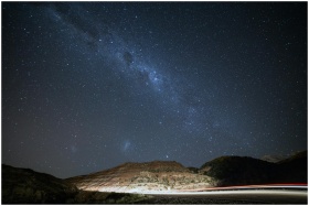 Stunning long exposure of a starry night sky over the Mendoza mountains with light trails on a road.