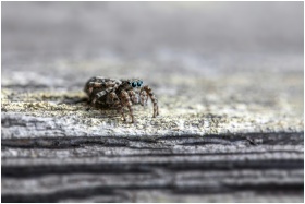 Detailed macro shot of a jumping spider with blue eyes on a wooden surface, showcasing intricate details.