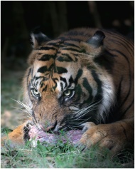 Close-up shot of a tiger eating meat in the wild,