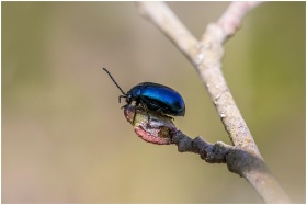 Detailed macro shot of a metallic blue beetle perched on a branch outdoors.