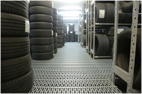 Rows of stacked tires in an indoor industrial warehouse for storage.