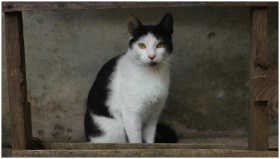 A black and white cat sits against a rustic wooden and stone background.