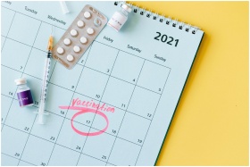 Calendar with vaccination date circled alongside vaccine vials and syringe for COVID-19 prevention.