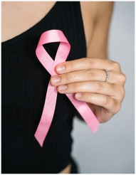 Close-up of a woman holding a pink ribbon for brea
