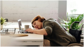 Woman in wheelchair sleeping at desk with laptop, illustrating exhaustion and remote work challenges.