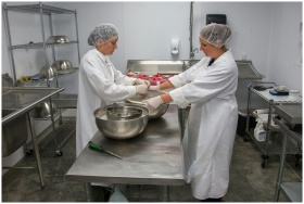 Two women in white coats and hair nets using stainless steel bowls in a professional kitchen setting.
