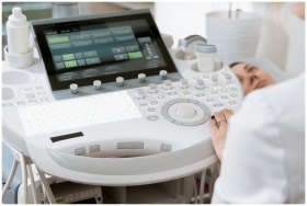 Close-up of a professional conducting an ultrasound examination in a modern medical clinic.