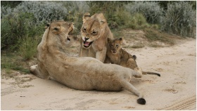 A powerful pride of lions, including lionesses, ex