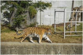 A majestic tiger walking in its enclosure on a sunny day in the zoo.