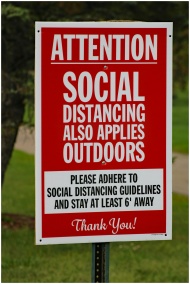 Attention sign for maintaining social distancing outdoors during the pandemic.