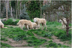 A serene scene featuring a group of Arctic wolves in their natural habitat surrounded by greenery.