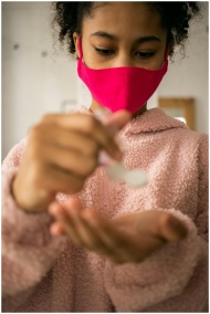 A teenage girl in a pink mask applying sanitizer at home.