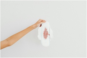 A hand holding a menstrual pad with blood stains, emphasizing menstruation awareness.