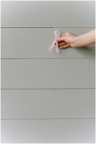 A hand holding a pink ribbon against a neutral bac