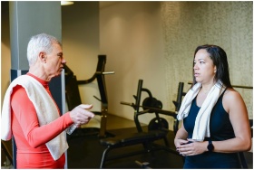 An elderly man and woman discuss fitness routines in a gym setting.