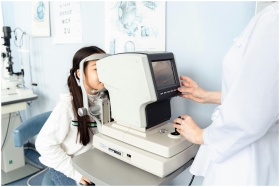 A child undergoing an eye exam in a modern optomet