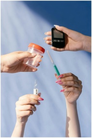 Collection of hands holding medical tools for diabetes management including glucometer and syringe.