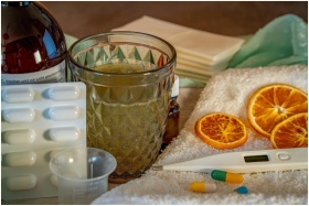 A collection of home remedies and medications for treating cold and flu symptoms, including a thermometer, pills, and herbal tea.