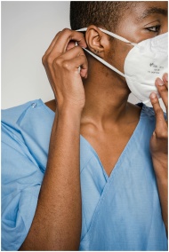 Crop African American female doctor in blue uniform adjusting protective mask and looking away