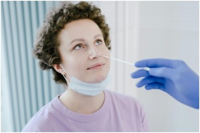 A woman in a medical facility receiving a nasal sw