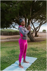 Adult woman practicing yoga poses outdoors in a se